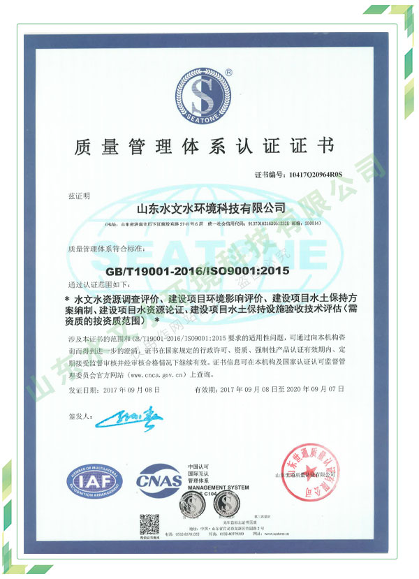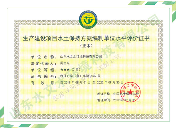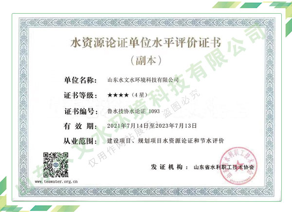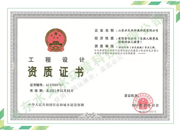 公司擁有水利工程設(shè)計、水土保持、水文水資源調(diào)查評價、水資源論證、建設(shè)項目環(huán)境影響評價、市政公用工程施工總承包、水利水電工程施工總承包、電子與智能化工程專業(yè)承包等資質(zhì),2017年通過質(zhì)量管理體系、環(huán)境管理體系、職業(yè)健康安全管理體系認(rèn)證;2020年被評為國家級高新技術(shù)企業(yè),同年被中國水利企業(yè)協(xié)會推薦為第一批“合同節(jié)水服務(wù)企業(yè)”;2021年被山東省、濟(jì)南市評為 “專精特新”中小企業(yè)。業(yè)務(wù)范圍涉及水利工程設(shè)計;節(jié)水設(shè)計、改造、水平衡測試;山洪災(zāi)害調(diào)查;城市水資源調(diào)查評價;建設(shè)項目水土保持方案編制、監(jiān)測、驗(yàn)收、水土保持規(guī)劃;水安全保障規(guī)劃、建設(shè)項目水資源論證、規(guī)劃水資源論證;建設(shè)項目環(huán)境影響評價;入河排污口論證;防洪影響評價;市政公用工程施工、水利水電工程施工、電子與智能化工程施工等。